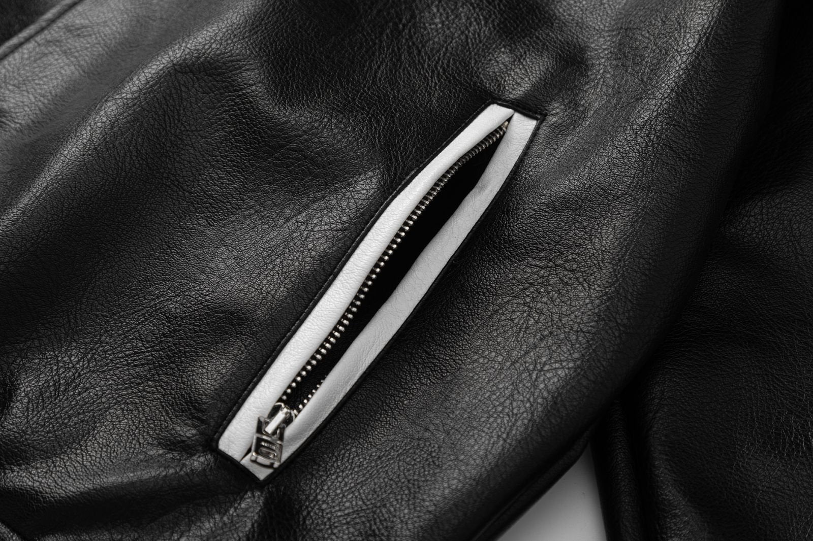 Grained leather jacket. · Striped rib-knit stand collar, hem, and cuffs · Press-stud closure · Logo embroidered at chest and back · Zip pockets at front · Text appliqués at back · Welt pocket at interior · Full twill lining Supplier color: Black