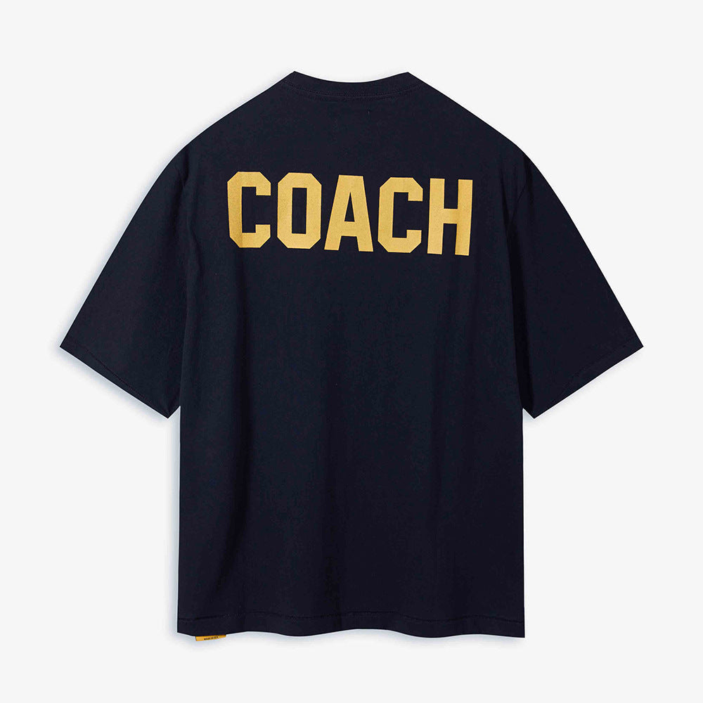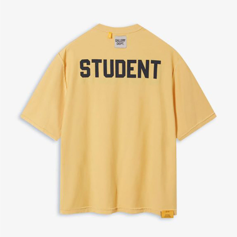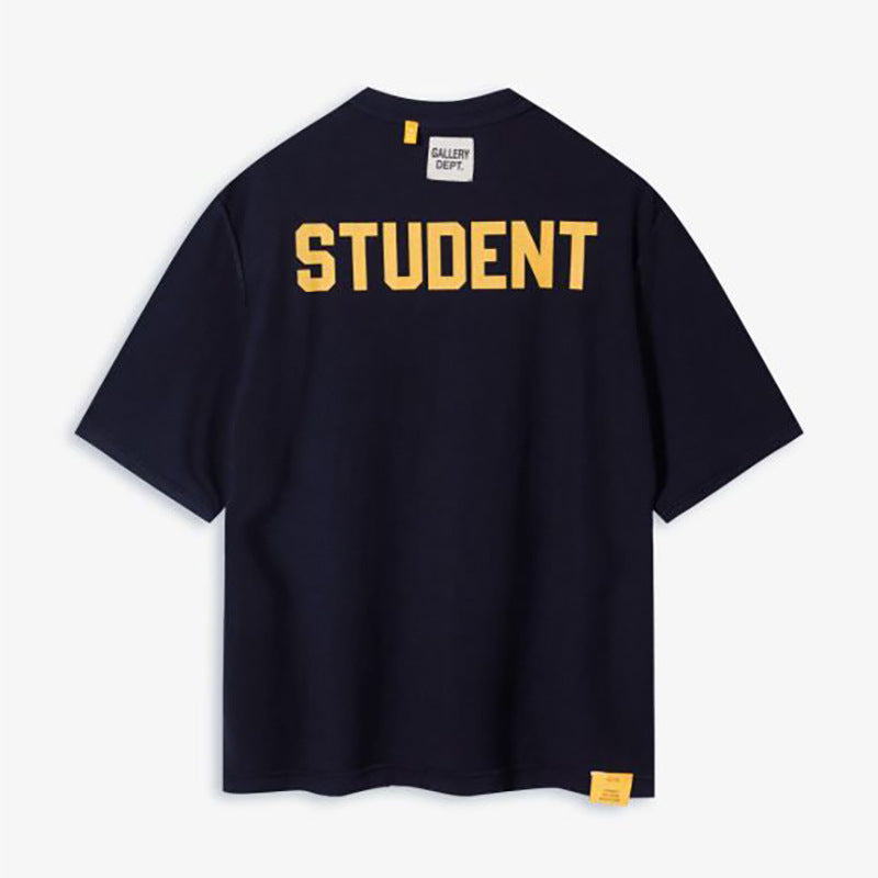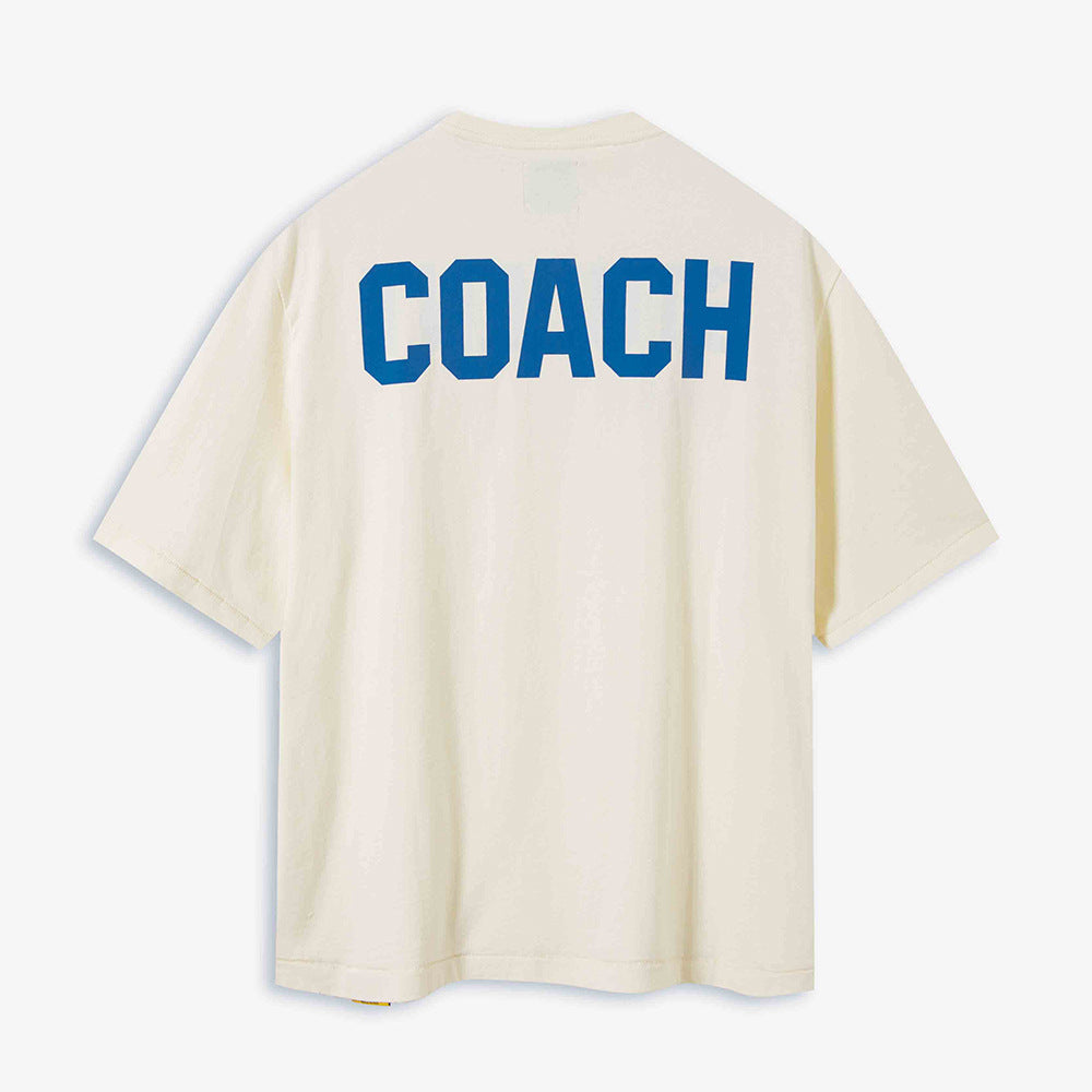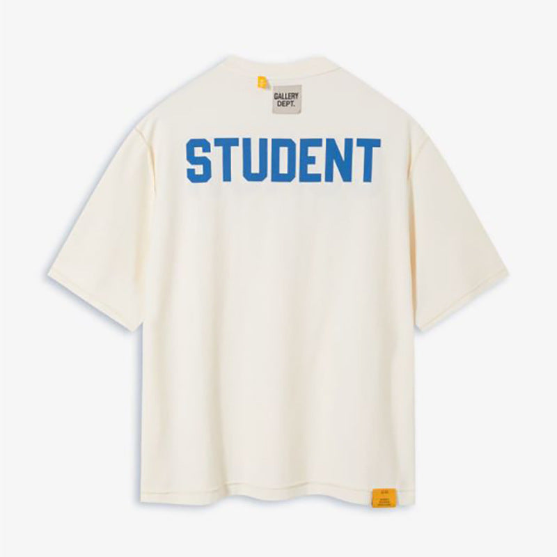 Gallery Dept. 'Student Coach' crop t-shirt in cream cotton with crew neck, short sleeves, blue logo print on the chest, maxi blue 'Coach' print on the back, maxi blue 'Student' print on the other, straight hem. Colour: white