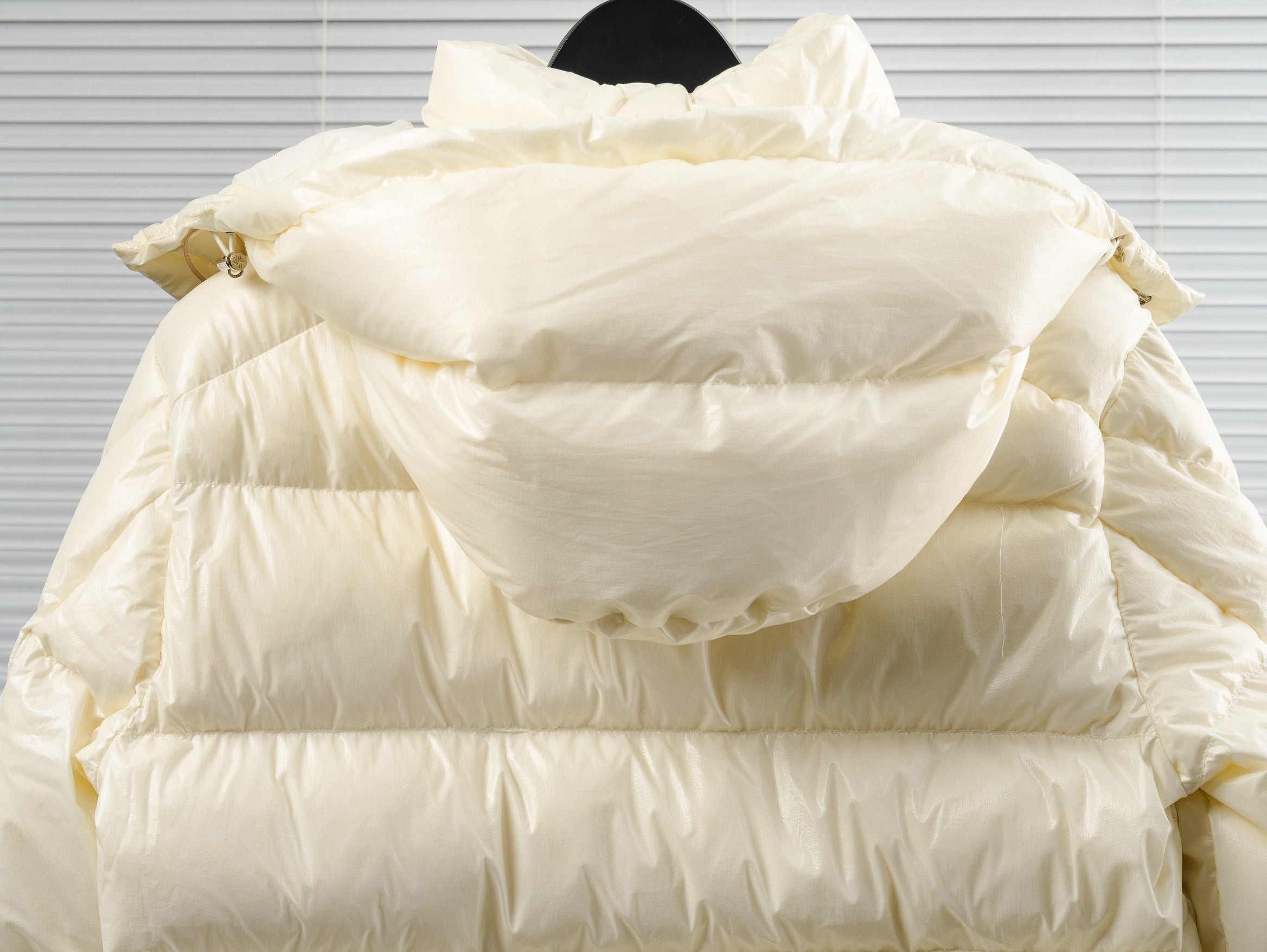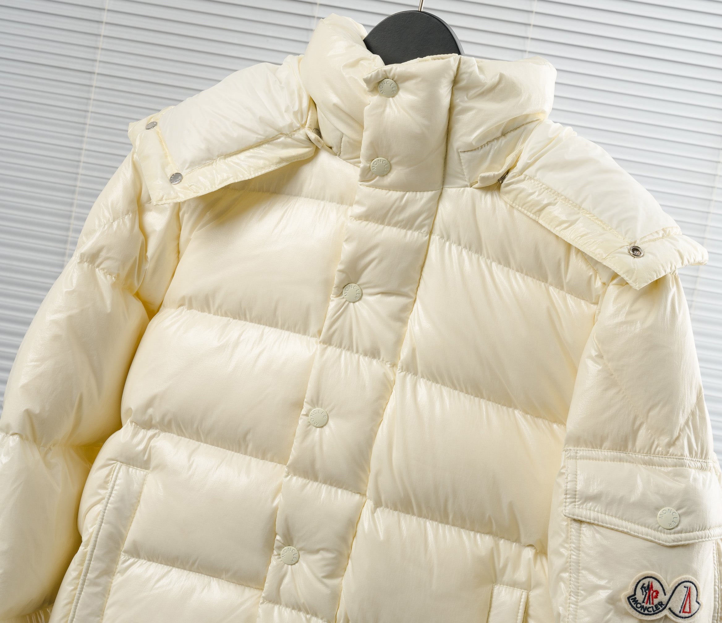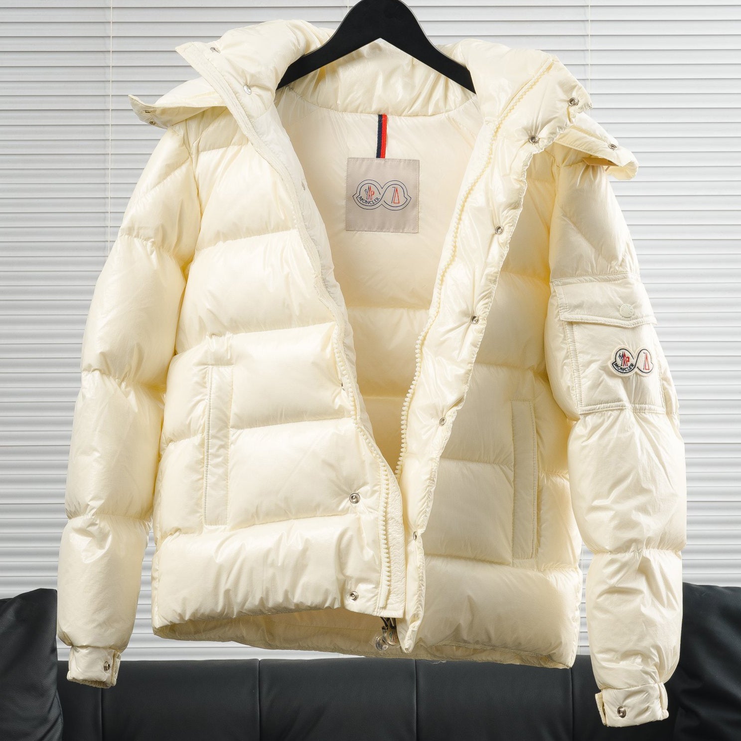 • Channeling Moncler's sporty spirit, the Solayan is a micro chic down jacket in a strong boxy shape. The short puffer is adorned by tricolour stripes on the sleeve, a seasonal adaptation of a brand signature. A practical pull-out hood finishes the design.