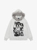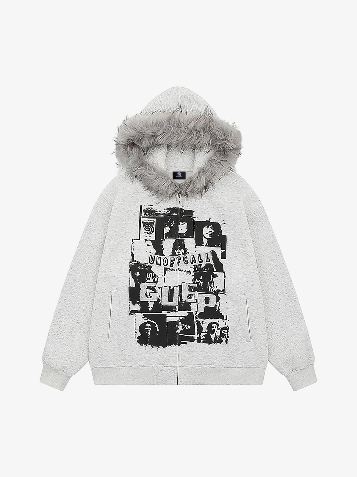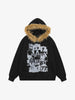 • Design Elements: Bold graphic print featuring collage-style images, faux fur-lined hood, front zipper closure