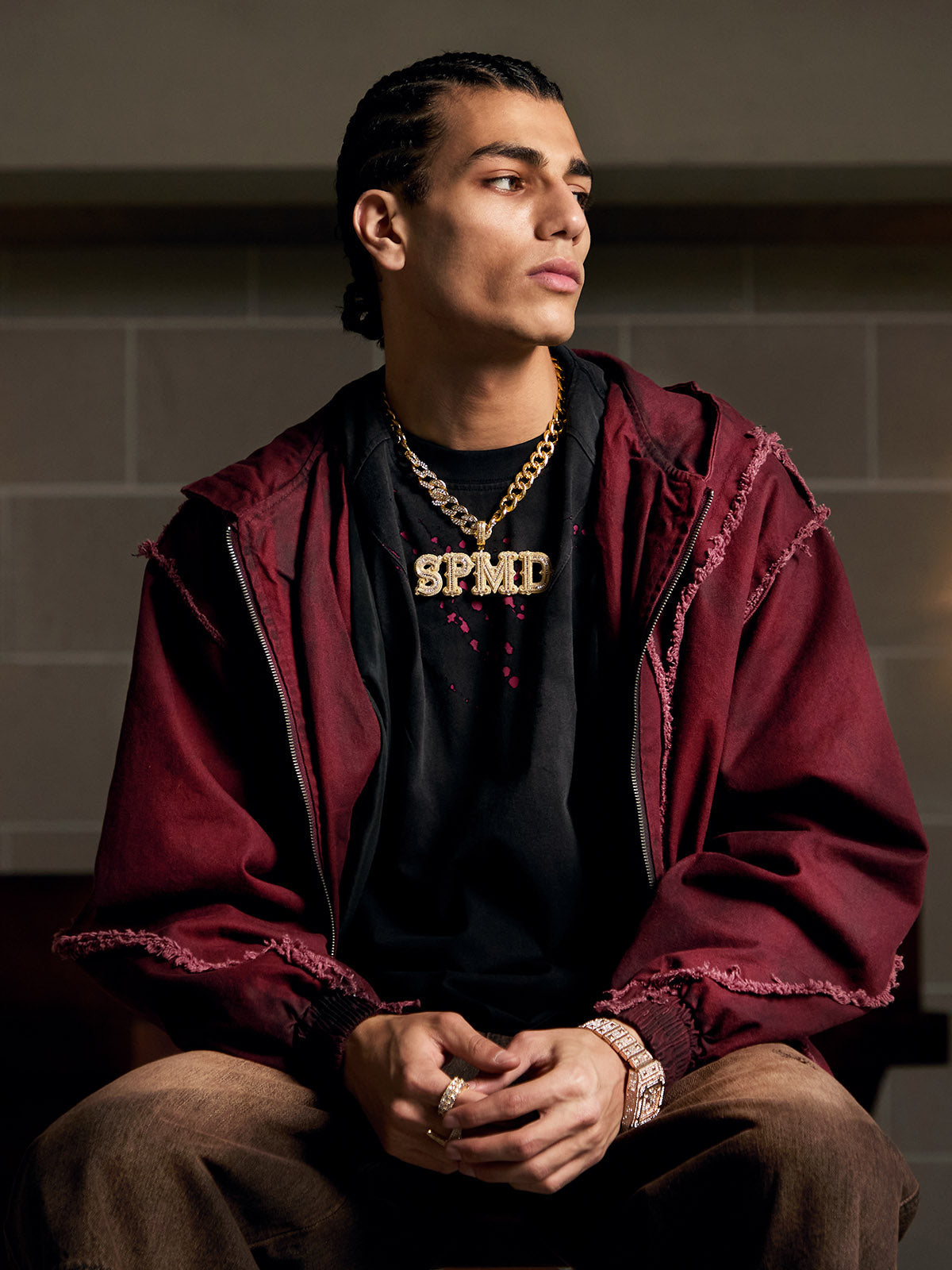 • Design Elements: Frayed Edges, Front Zipper Closure, Hooded Neckline